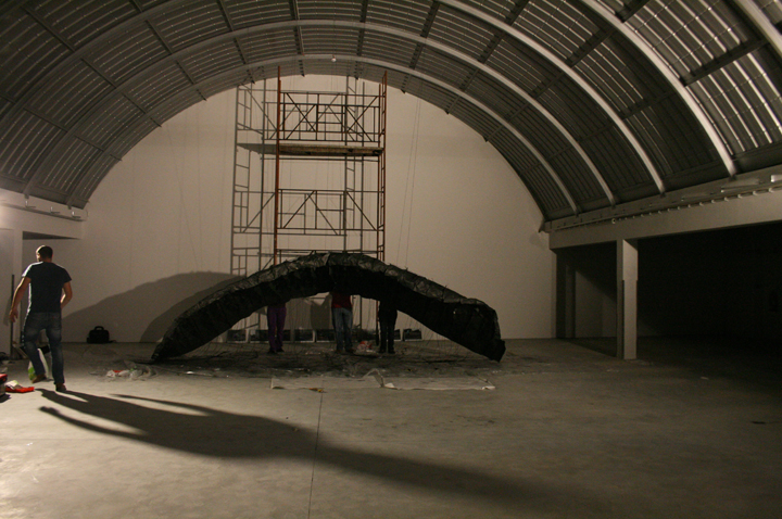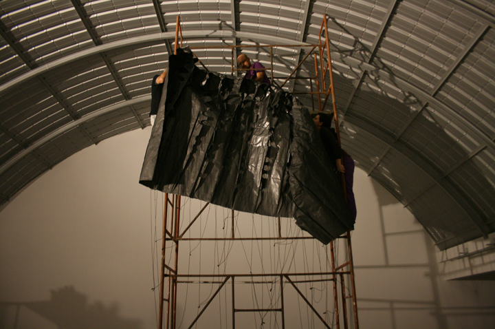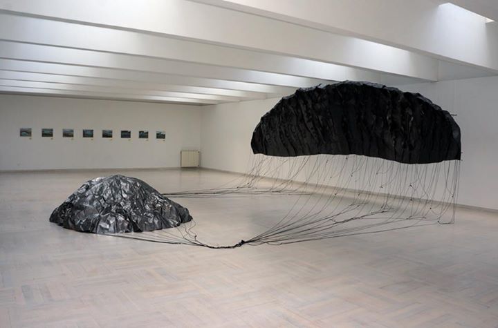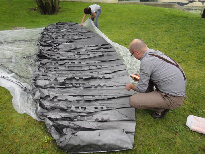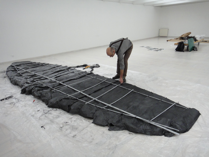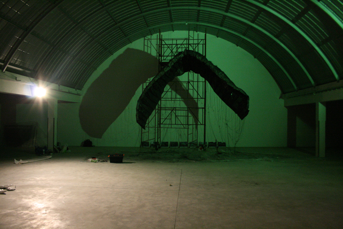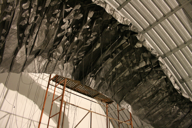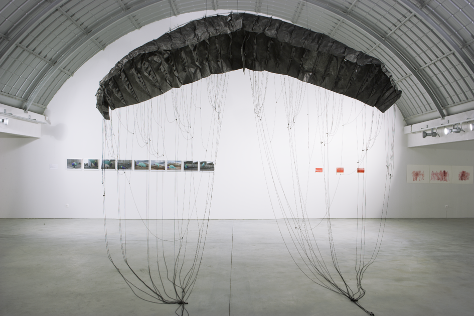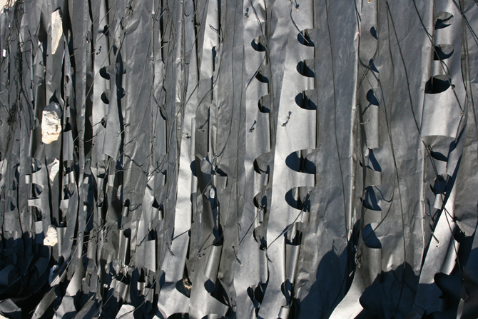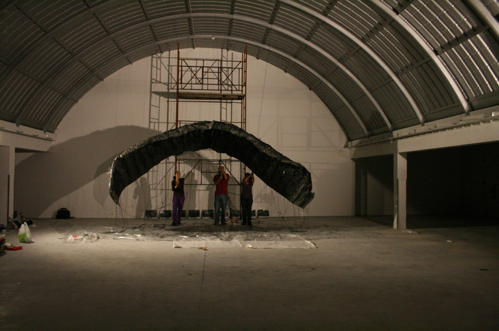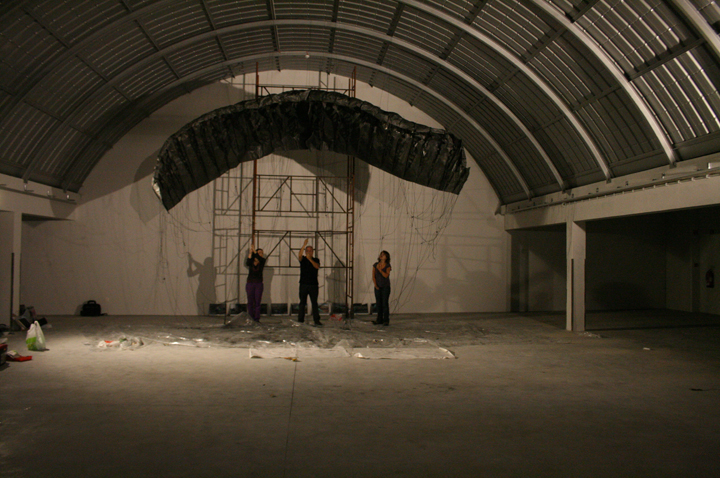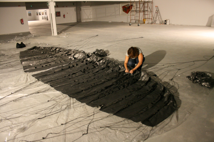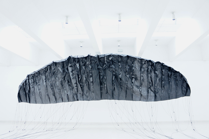 Graphite powder and pencil on paper, nylon and cotton thread, metal eyelets.