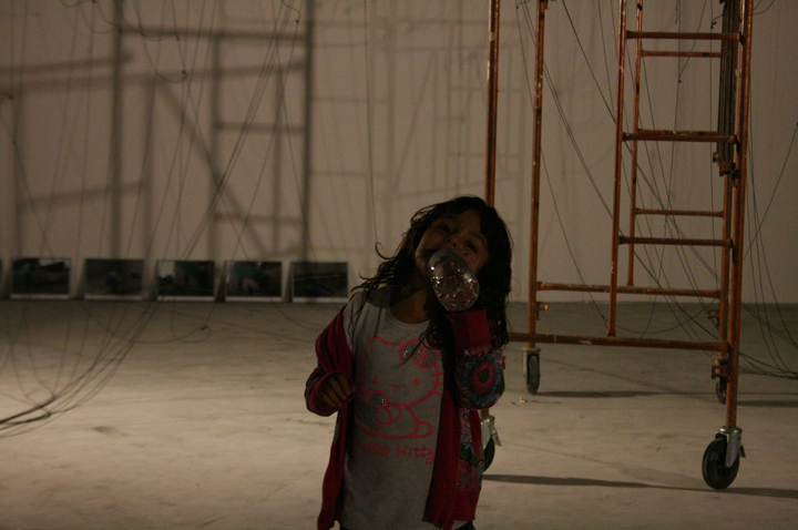 Grafite em pó e lápis sobre papel, fios de algodão e nylon, ilhóses de metal.